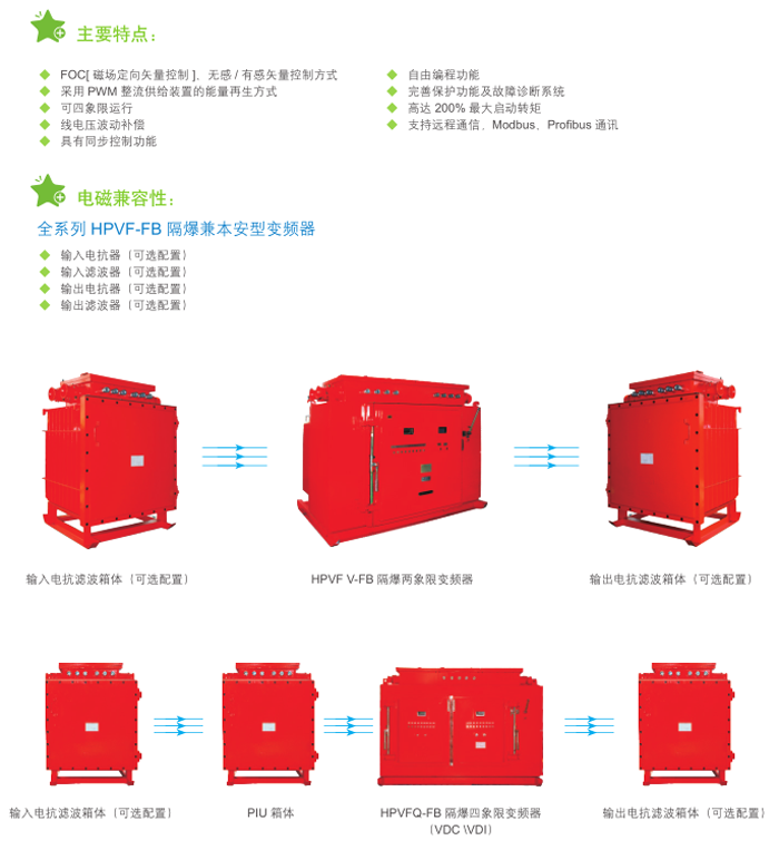 HPVF-FB隔爆兼本安型變頻器以全新的設(shè)計(jì)思路,將變頻、矢量控制、隔爆及本質(zhì)安全等技術(shù)相結(jié)合,具有多種控制模式、低速高轉(zhuǎn)矩等特性,可四象限運(yùn)行,具有能量回饋功能,節(jié)能效果明顯。主要適用于煤礦井下或露天礦山、選煤廠等有爆炸危險(xiǎn)場所的大負(fù)荷設(shè)備軟起動(dòng)、軟停車控制。