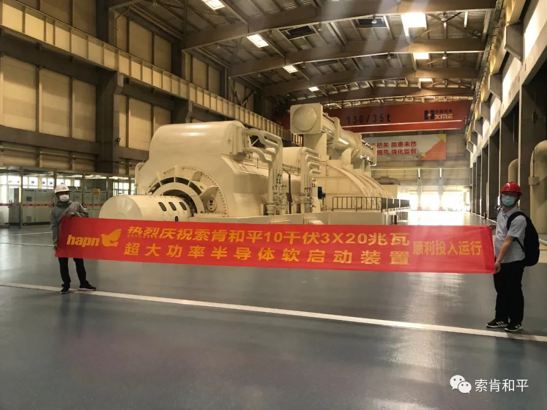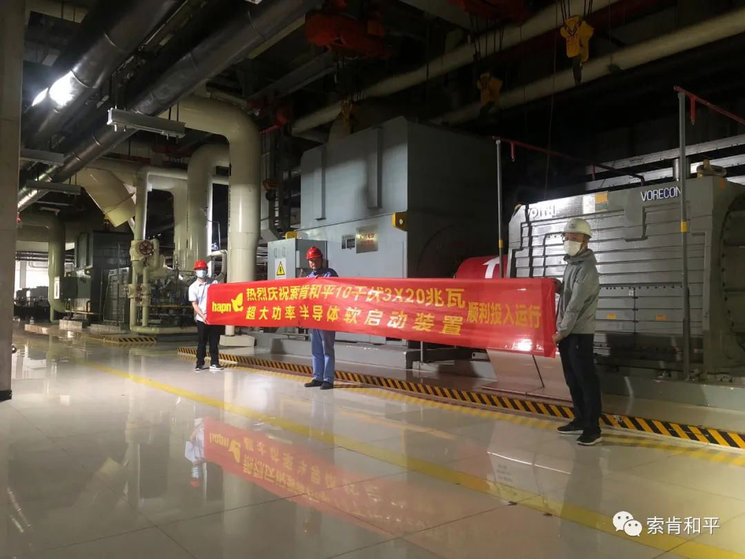 2020年5月20日,在索肯和平(上海)電氣總經(jīng)理陳勇,工程師潘工、趙工、呂工,能源公司王副總經(jīng)理、電氣總工程師李總工和電氣負(fù)責(zé)人杜工等相關(guān)人員協(xié)同下,20兆瓦級(jí)高壓固態(tài)軟起動(dòng)裝置一次啟動(dòng)完美成功,代表著能源公司二期工程勝利完工。