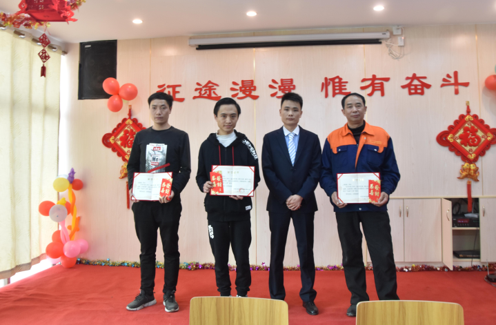 生產(chǎn)部經(jīng)理廖小強為伍志強、柳敏捷、戴剛、韋進勇頒發(fā)先進個人獎