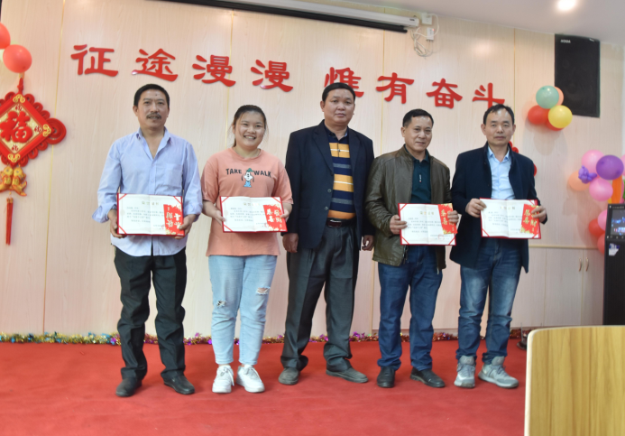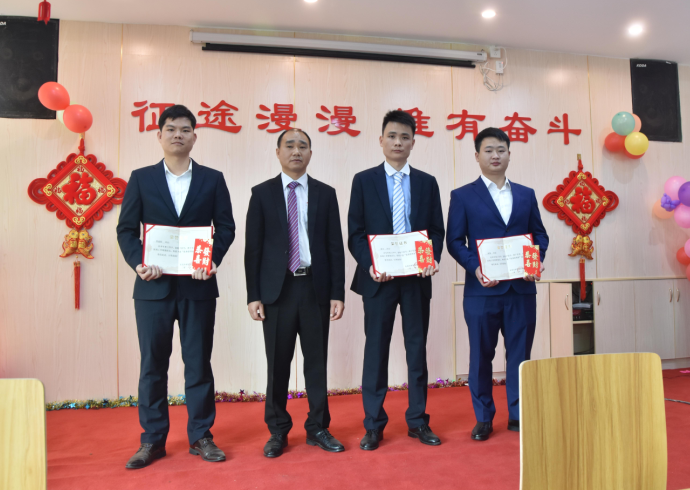營銷部經(jīng)理伍綱強為邱高明、周美芳、黃榮先、龔超頒發(fā)先進個人獎