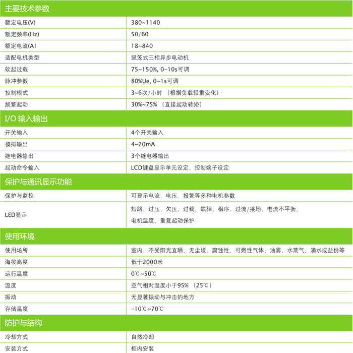 對電網(wǎng)及機械設備沖擊小等優(yōu)點,是傳統(tǒng)起動方式理想的更新?lián)Q代產(chǎn)品。適用于石油、冶金、礦山、選煤廠含有爆炸性氣體(甲烷)和煤塵的煤礦井下的重載或使用條件惡劣的三相異步電動機的軟起動、軟停車控制。