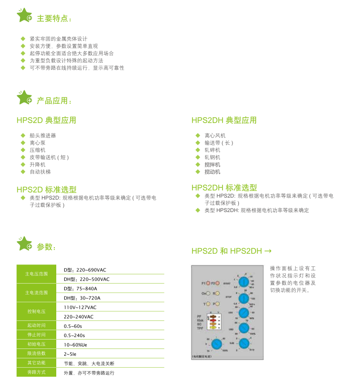 HPS2D75...840HPS2DH30...720 軟起動(dòng)器均有著堅(jiān)固的金屬殼體設(shè)計(jì),可分別適用于常規(guī)負(fù)載和重型負(fù)載的各種應(yīng)用場(chǎng)合它結(jié)構(gòu)牢固緊湊,安裝方便快捷。所有參數(shù)和功能選項(xiàng)均通過(guò)前面板上的調(diào)節(jié)電位器和功能切換開(kāi)關(guān)來(lái)設(shè)定和選擇。直觀清晰,各工作階段和狀態(tài)及故障均有相應(yīng)LED 指示讓用戶一目了然。特設(shè)節(jié)能功能,當(dāng)電機(jī)運(yùn)行在空載或輕載時(shí)自動(dòng)降低負(fù)載電壓,